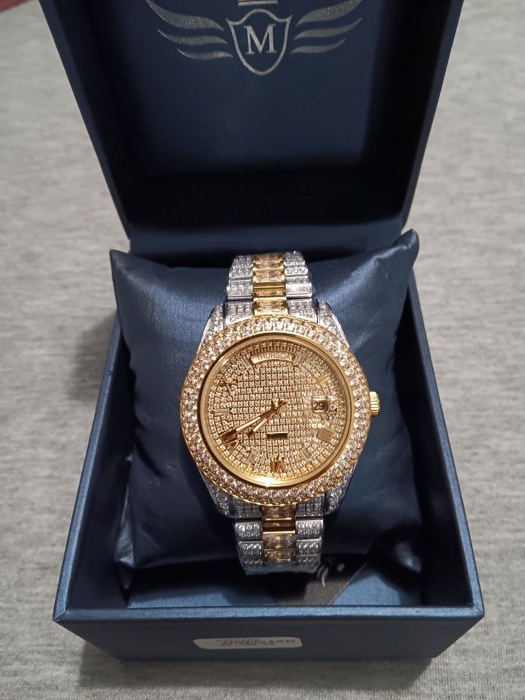 Material - stainless steel Finish - ion plated for durability and resilience Stone type - Grade AAA lab Stones Automatic movement 5 ATM water resistant Adjustable links 40mm