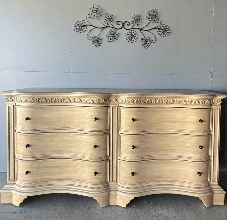 6-drawer dresser refinished in taupe color and glazed to create a PB wood finish. 🍁Manufactured by Bernhardt 🍁 6 "curved" and spacious drawers 🍁 Dovetail drawers slide smoothly 🍁76"W x 21"D x38.5"H