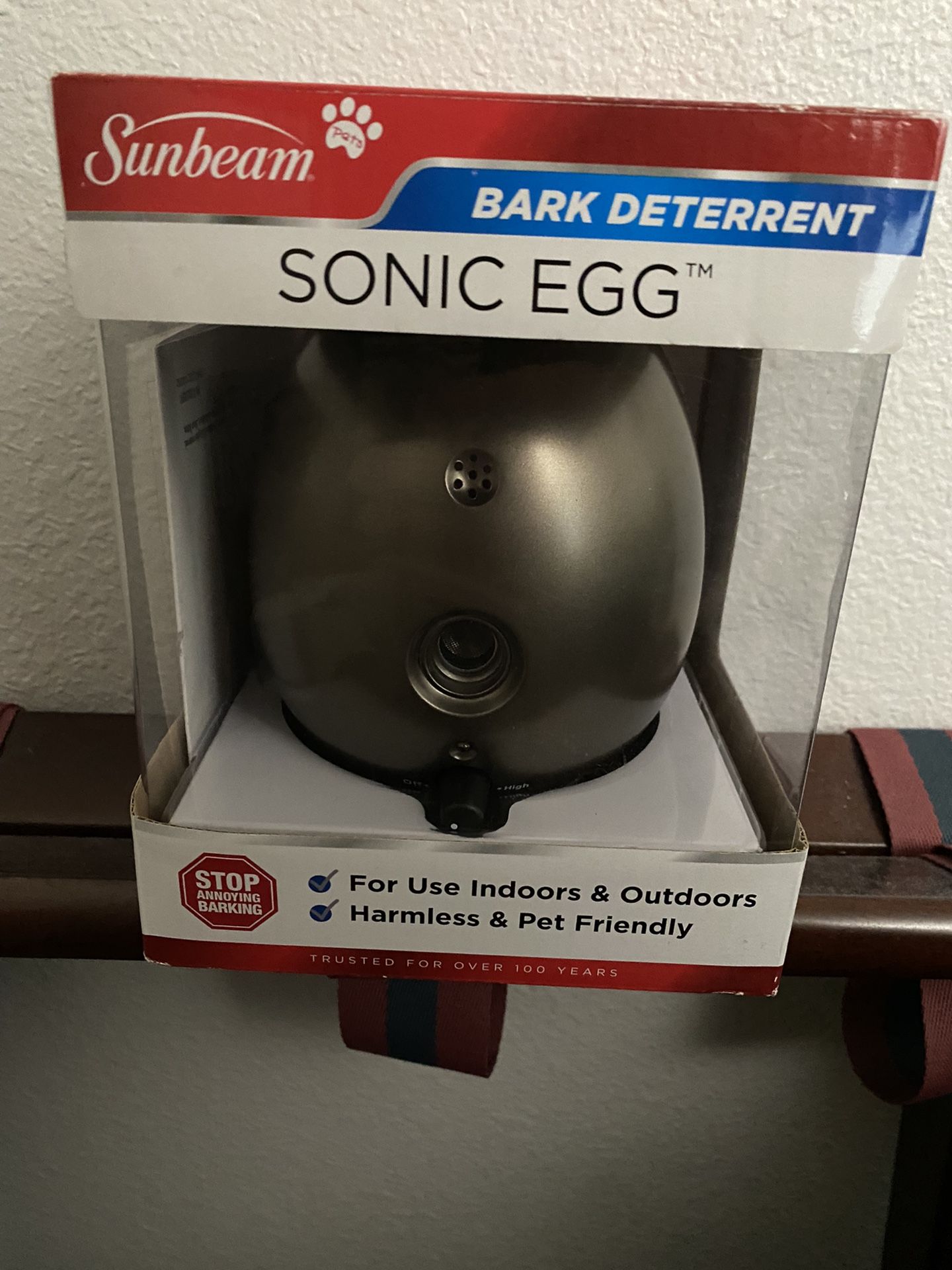 New in the box, Sunbeam sonic egg bark deterrent. For indoor or outdoor use. $40. Thank you.