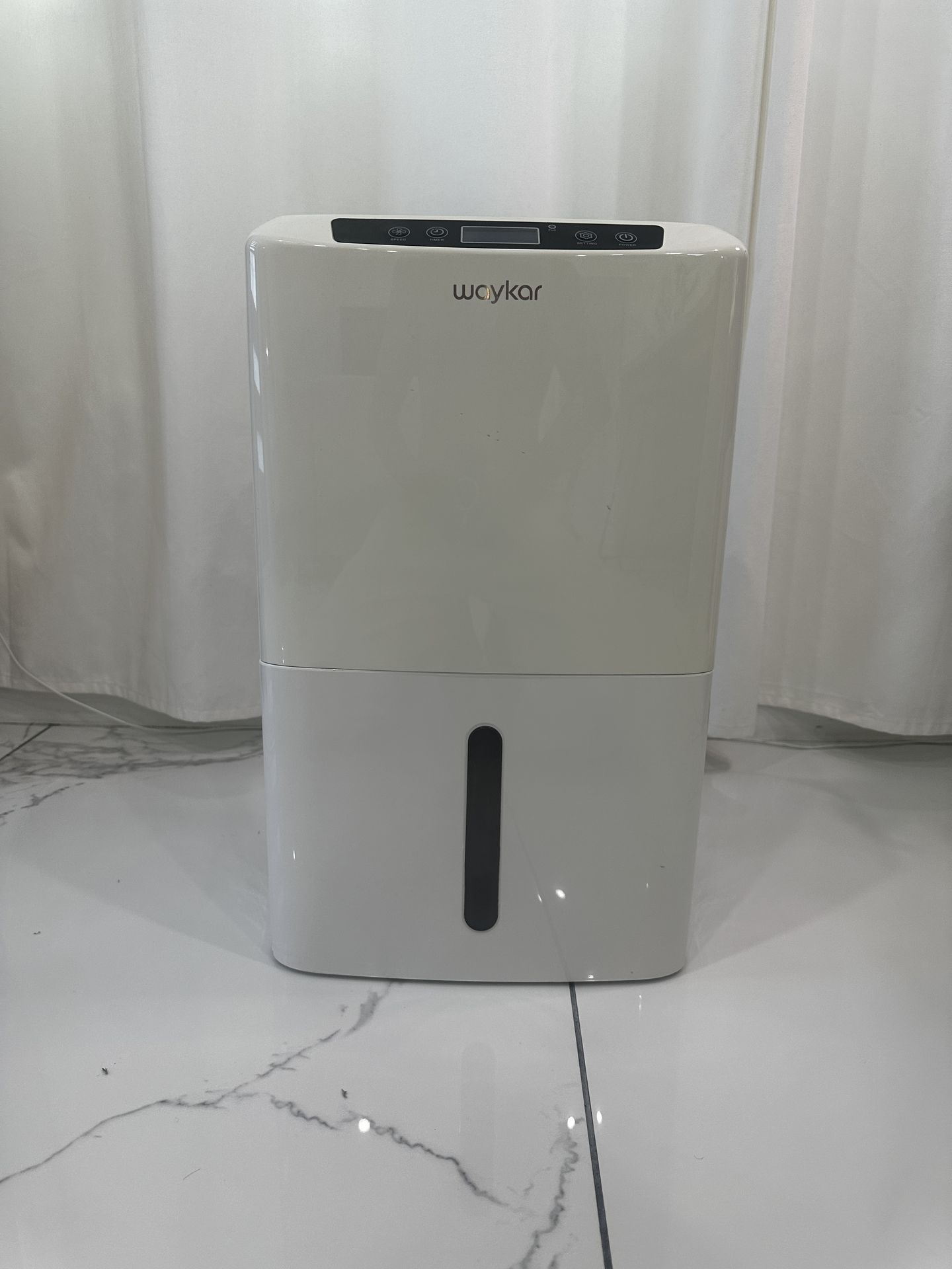 Waykar dehumidifier. Has digital display and easy to use controls for speed, timer, and settings. Water tank has a level indicator. Can also set up for continuous drainage.