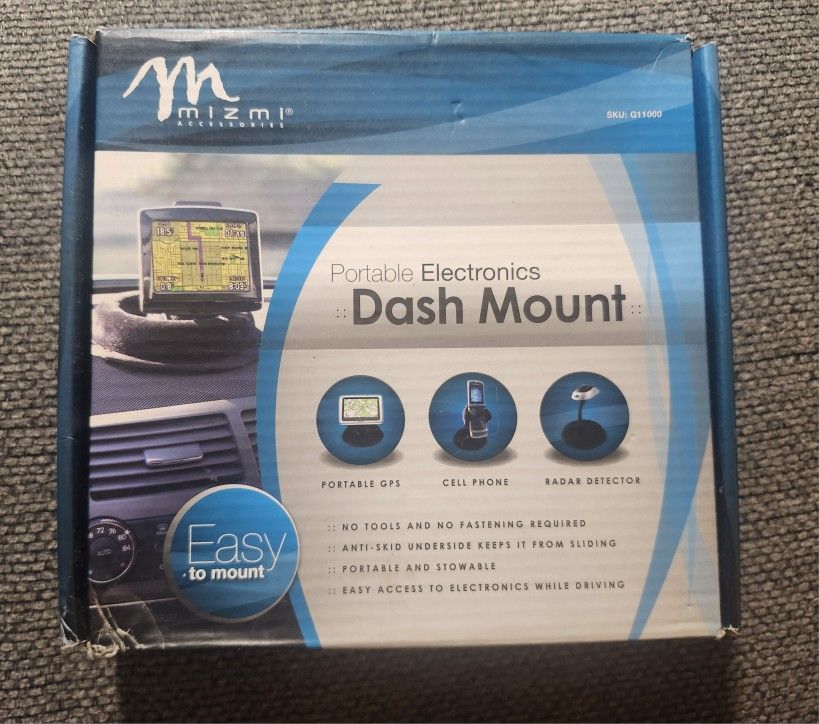 This is a Mizmi G11000 universal portable electronics dash mount, designed for use with portable GPS units, cell phones, and radar detectors. Easy to use: No tools or fastening required for installation. Secure: Features an anti-skid underside to prevent sliding. Portable: The mount is portable and stowable. Convenient: Provides easy access to electronics while driving. Have 8 selling them at $3 a piece or $15 for all
