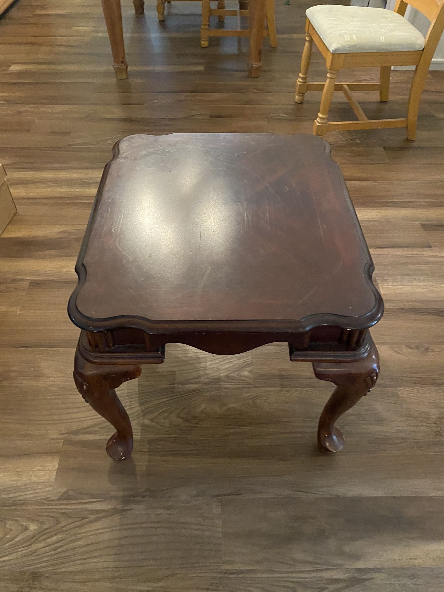 2 foot by 2 foot standing 1 foot and 8 inches tall this all wood table. Used with scuffs and scratches. Cash Only. Pick up Only.