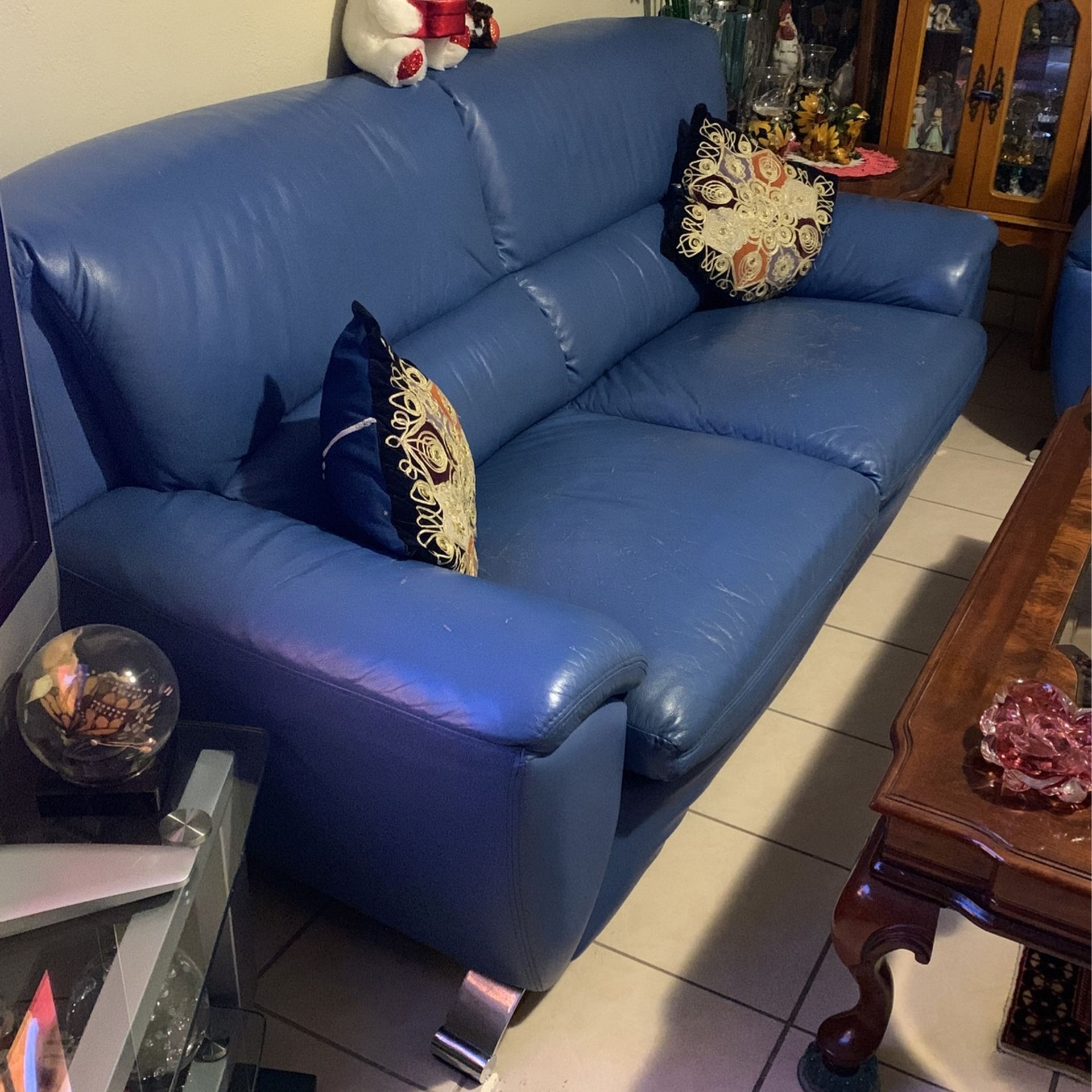 Light blue sofa, a little under 7ft long (83inches) sofa does have scratches on seats from people sitting/kids sitting but still sturdy and clean.