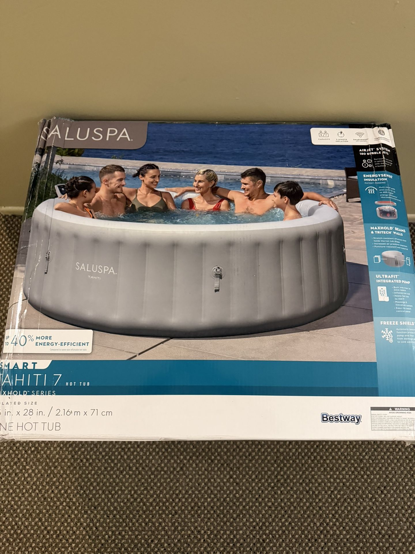Brand new, in box SaluSpa Tahiti Energy Efficient Smart Air Jet Inflatable Hot Tub. Fits 5-7 people, app control, comes with pump.