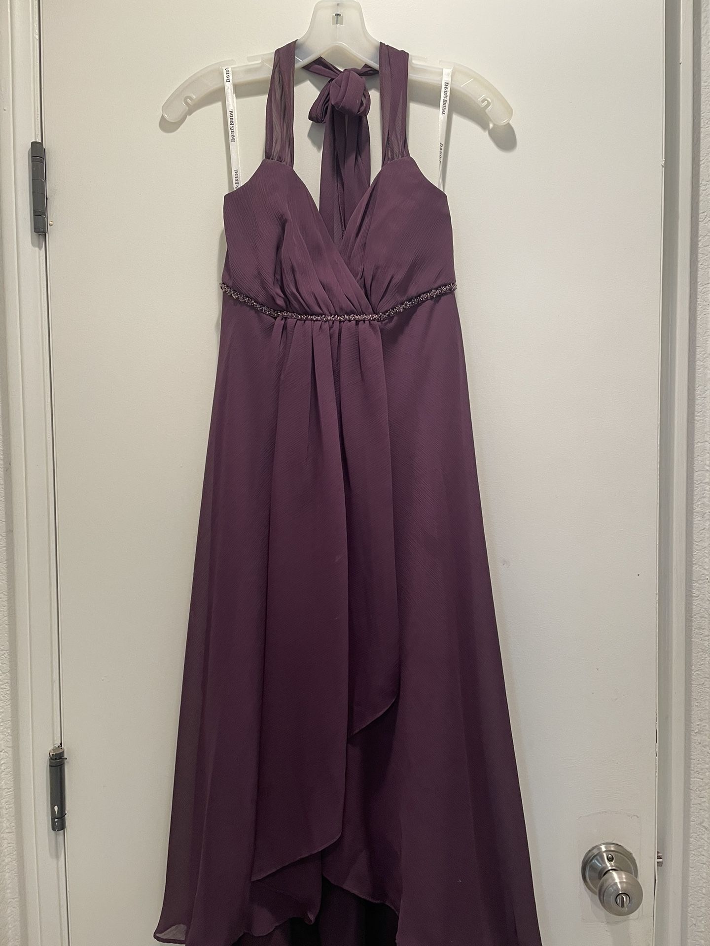 Selling a stunning deep plum halter dress, perfect for formal events, weddings, or special occasions. Features a flattering empire waist with delicate beaded detailing, a flowy asymmetrical high-low hem, and a tie-back halter neckline for an adjustable fit. The lightweight chiffon fabric drapes beautifully, making it both comfortable and elegant. Condition: Gently used, in excellent condition Size: 2 Feel free to message me for more details!