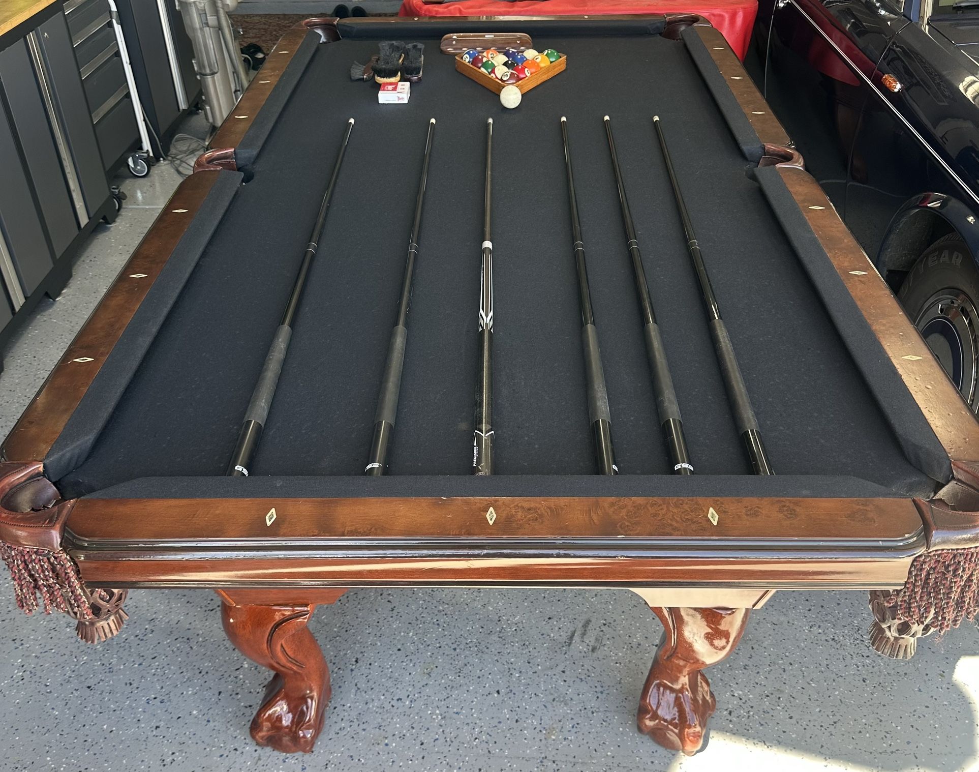 8 foot slate American Billiards pool table Body and felt are on good condition. Minimal wear. Like new. Comes with sticks, balls, brushes, chalk, cover, rack, triangle… $2000 with delivery Pool table Pool Shuffle board Game room Air hockey Dart Bar table Bar Game room