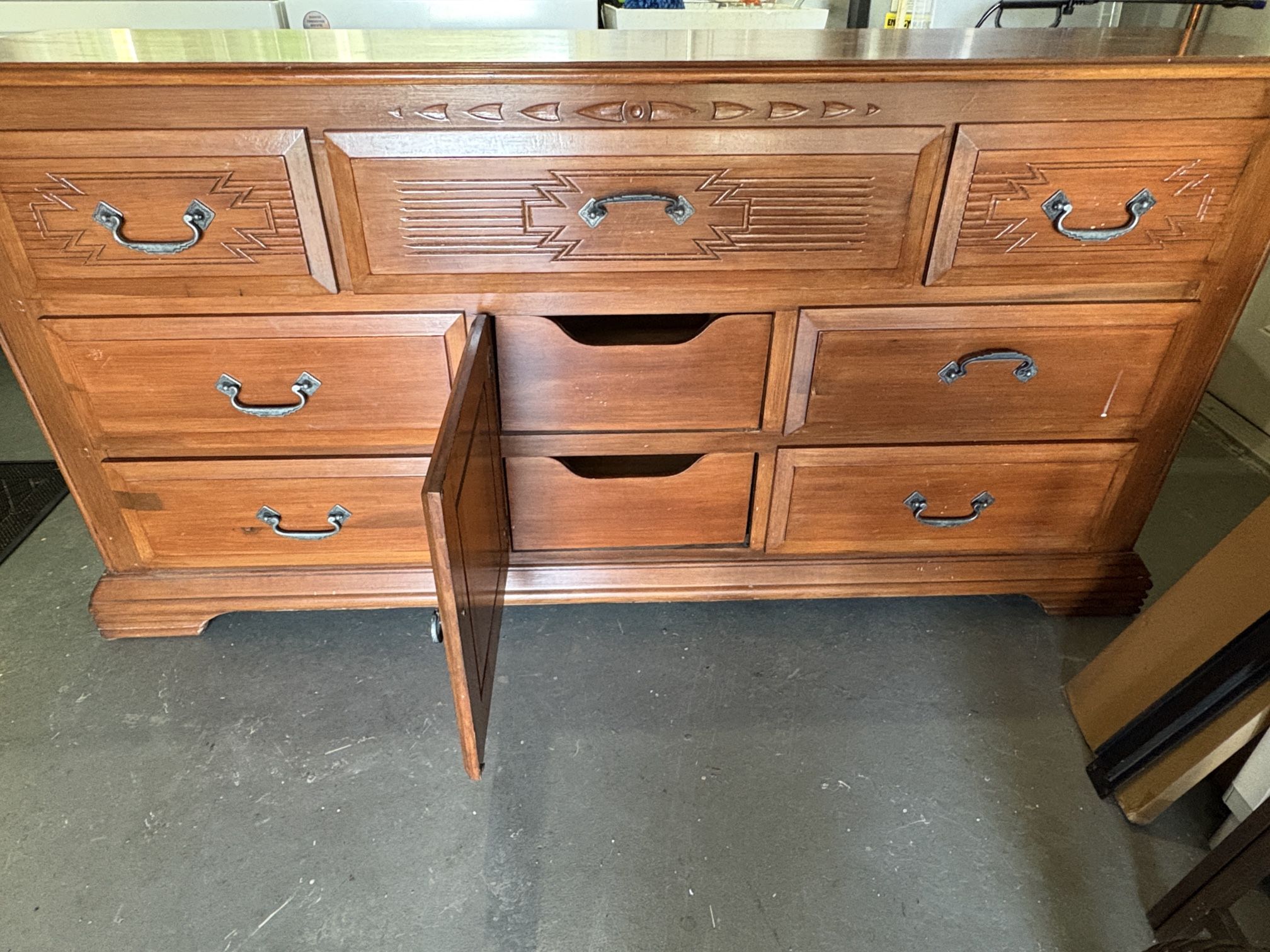 Fair condition 9-drawer dresser. Has minor scratches on top and sides. Will likely need refinishing. Several drawers will need the tongue and grooves reglued. All drawers slide and function. Non-smoker house.