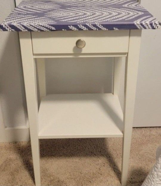 IKEA HEMNES Nightstand, white stain 18 1/8x13 3/4. Water cup ring mark on top so I refinished with this feather wrap look for the top. Color blue/white. Stainless steel finish knob. Coordinates with other furniture in the HEMNES series. Materials Main parts/ Shelf: Solid pine, Stain, Clear acrylic lacquer Drawer sides/ Drawer back: Solid pine Product Size- Width: 18 1/8 " Depth: 13 3/4 " Height: 27 1/2 " Pick up in University Place. Smoke free home. Asking $60 OB