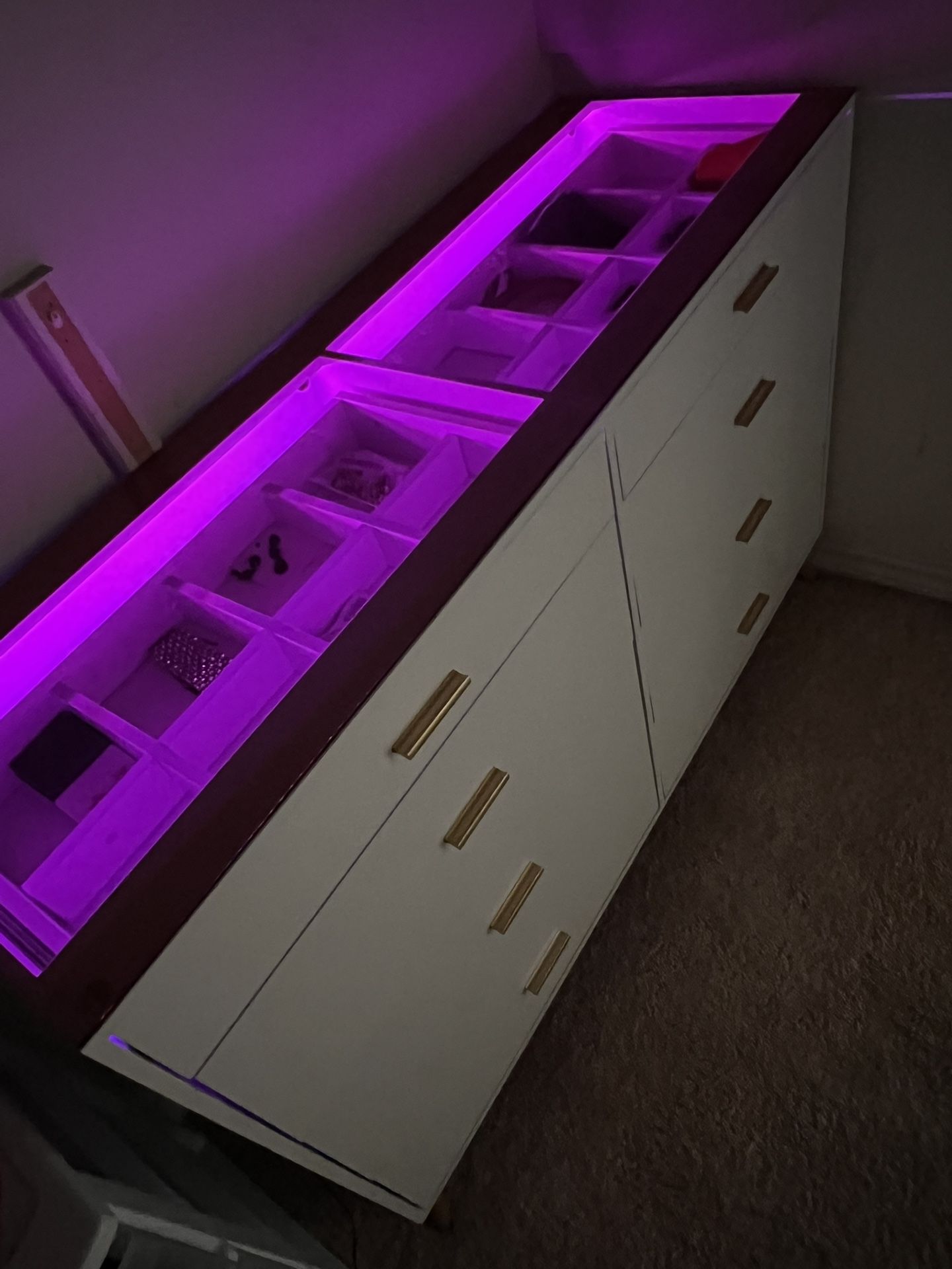 Fully assembled gently used dresser with cute lights. Top two drawers can be seen thru the glass top, and have organizer compartments. The rest of the drawers are normal.