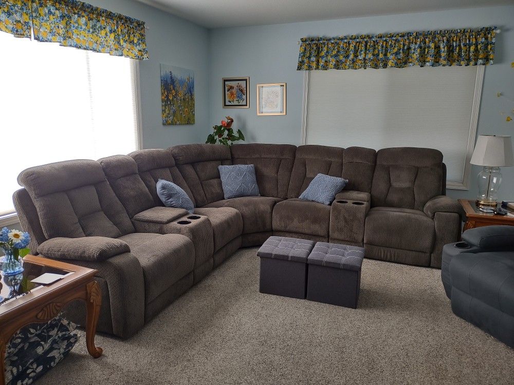 7'9" each direction, ends recline, 2 cubbies with drink holders, no rips or tears, great condition, $525, you pickup, heavy