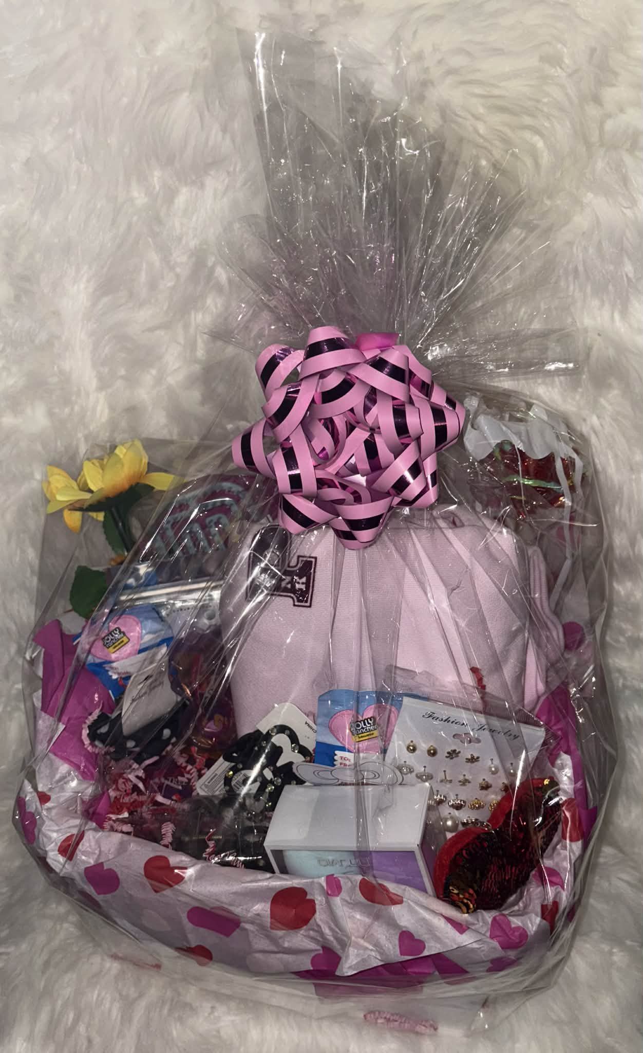 Basket #17 $70 Brand Pink: Pink P Sweater With Hoodie Size: XL Reg Price $59.95 Tree Hut Raspberry Frizz Shea Sugar Scrub Earrings Set Polka Dot Head Band Bow Hair Clip Mini Bow Hair Clip Make Up Sponge Set Heart Key Chain 5 Candies Hair Brush Sunflower Pen Gold Bracelet Light Up Rose “Foil Pouch” Eye Mask Lip Mask Free Delivery In Fresno Only