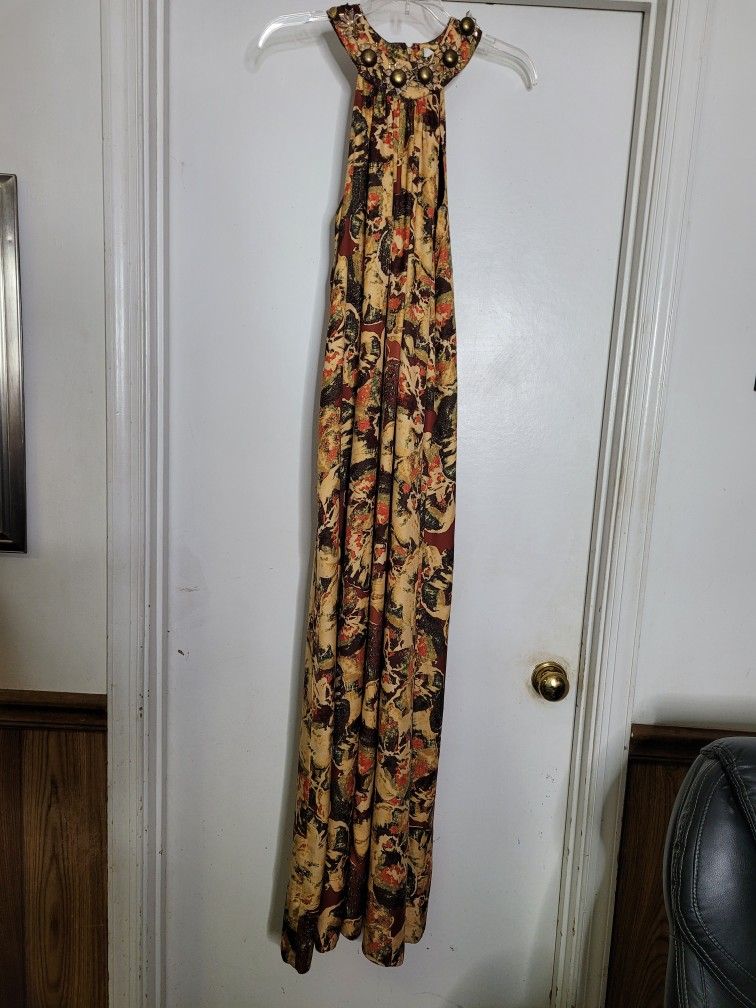 silk halter neckline dress. Size L , nice accents ( some missing, see photos). Duched details, embellishments.... brown slip underneath. Size tags missing... Really cute with nice gold sandals. Zipper up back