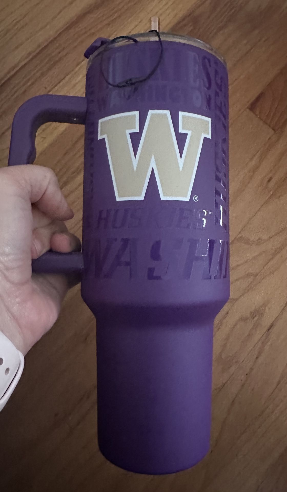 Washington Huskies 40oz stainless steel tumbler Purple cup with purple embossed letters and gold W Comes with clear lid and drinking straw NWT - never been used Perfect vessel for all your cold drink needs! Pickup is east Greenlake near I-5 unless you catch me out & about