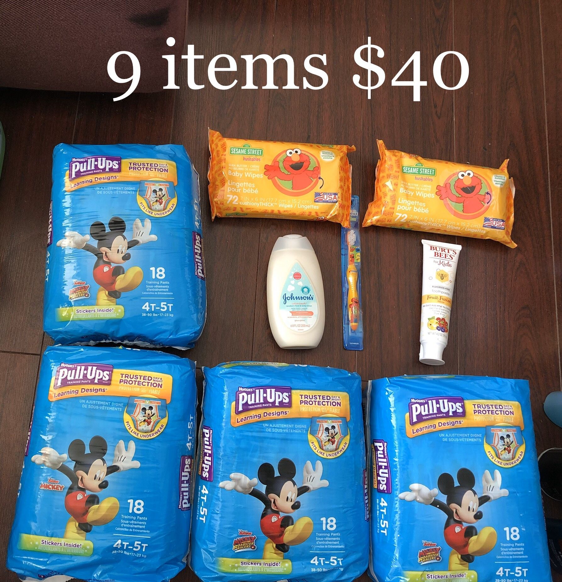 4 Huggies Diaper (4T-5T); 1 Johnson Cotton Touch Lotion; 144 Sesame Street Baby Wipes (72x2); 1 Burts Bee Toothpaste; 1 Sesame Street Toothbrush: 9 I