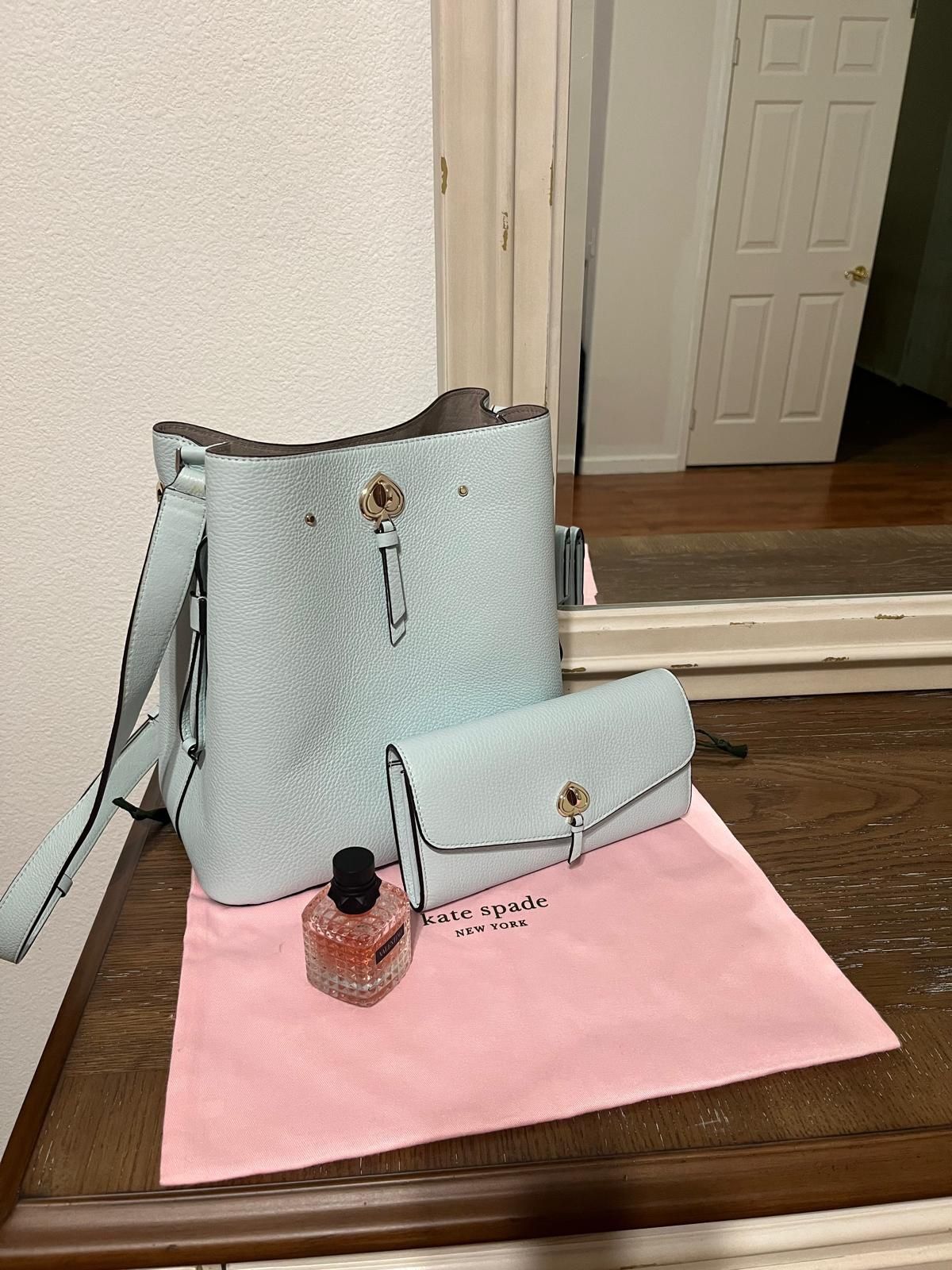 New with tag never used, comes with wallet and purse Baby blue color Large size, leather $120