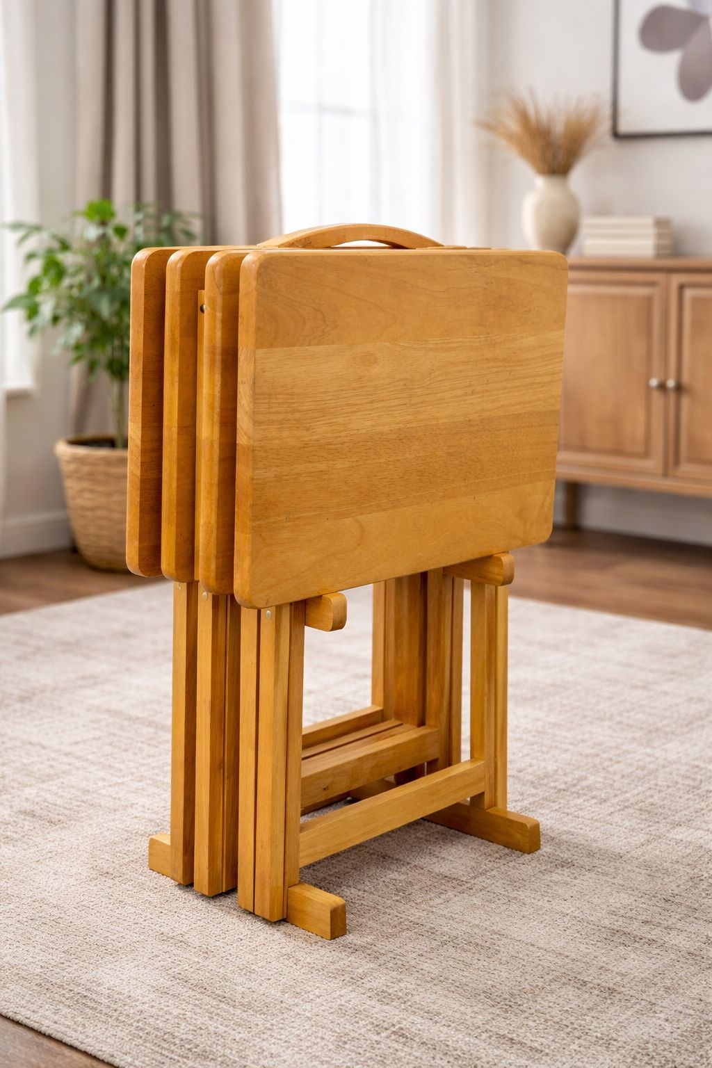 FOLDING TV TRAYS: Watch your favorite show while eating a delicious meal, or enjoy a late-night snack with this 5-piece set of multifunctional folding table trays EASY FUNCTIONALITY: Simply pull out a table from the rack, expand it, and stand it upright for a fully functioning table SOLID WOOD CONSTRUCTION: This charming 5-piece snack table set is made from solid and sturdy wood that stands the test of time COMPACT STORAGE RACK: Collapse each table when finished, and set it into the storage rack in an upright, filed position for easy and compact storage SPACIOUS TOP SURFACE: Each sofa snack table measures 14.57 inches wide, 19.09 inches long, and 26.00 inches tall, and contains a spacious, flat surface