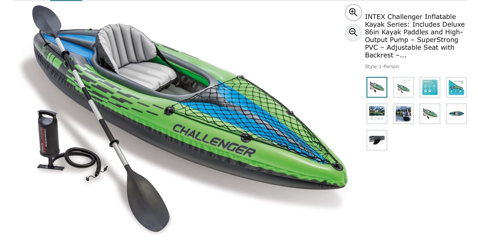 Brand Intex Item Weight 26 Pounds Material Plastic Color Green/Blue Style 1-Person About this item Plastic Imported SUPER-STRONG – SuperStrong enhanced molecular formulation PVC provides superior strength and durability, ensuring high impact and abrasion resistance LOW PROFILE DESIGN – The Challenger K1 has a streamlined low-profile design that is perfect for easy paddling in lakes and mild rivers COCKPIT SEATS – Built with removable and adjustable seats, the cockpit design is spacious and comfortable, providing plenty of room for your legs and gear REMOVABLE SKEG – Attached to the underside of the kayak, the removable skeg provides directional stability, making it easier to maintain a straight and steady course while paddling 1-PERSON CAPACITY – Inflated size is 9 feet x 2.6 feet x 1.1 feet with a weight capacity of 220 pounds and easily foldable to be put in the carry bag that allows for easy transportation