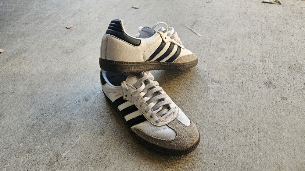 Selling a pair of Adidas Samba sneakers in size 3.5. These were lightly used by my son and are still in great condition, with plenty of life left in them. Classic white with black stripes, suede toe, and gum sole. Brand: Adidas Model: Samba Size: 3.5 (youth) Condition: Gently used, clean, well-kept Perfect for everyday wear, sports, or casual style.