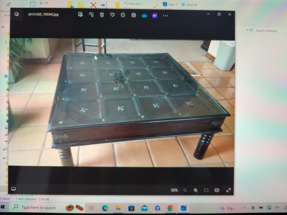 Beautiful wood and glass carved coffee table. Measures approximately 49 in. X 49 in. X 20 in tall. See coordinating items also for sale under reclaimed wood. Bedroom set, decorative door/gate.