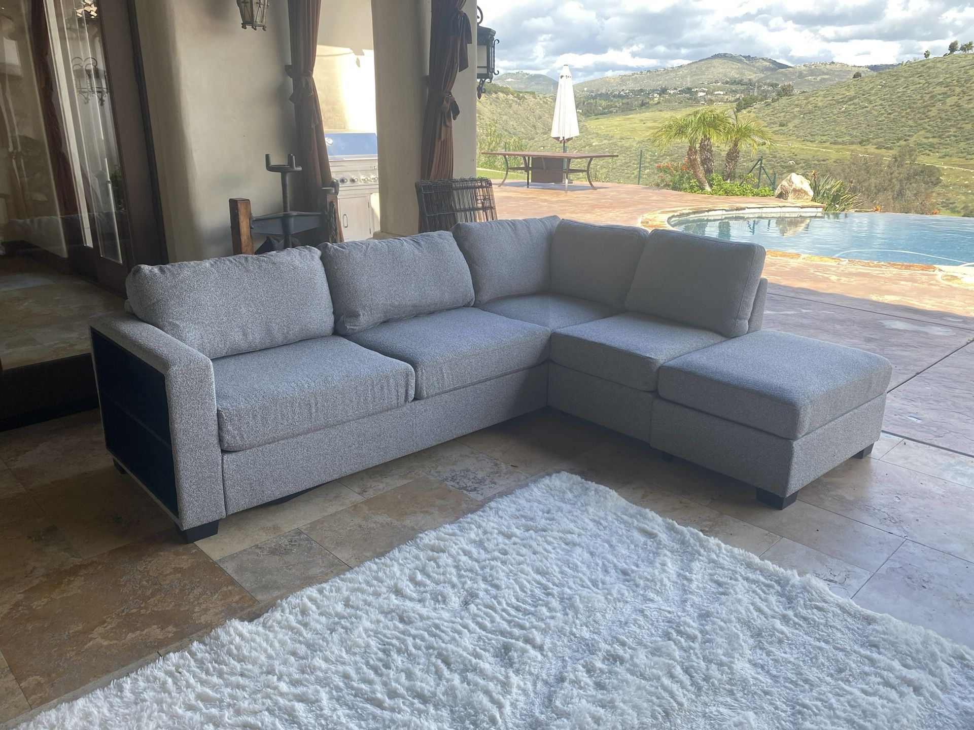 Modern gray sectional sofa with matching storage ottoman. Originally purchased for $700, selling for $300. This couch is super comfortable and versatile. The ottoman doubles as storage, making it great for blankets, pillows, or kids toys. Neutral gray fabric works with almost any decor style.