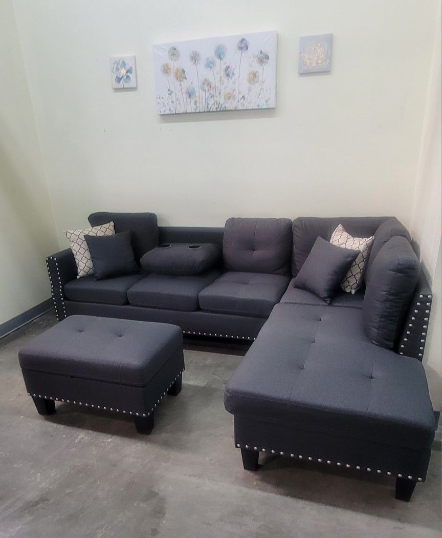 3 pc charcoal linen like fabric sectional sofa drop down cup holder chaise and ottoman nail head trim. This set includes the 2 pc sofa with drop down arm chaise sectional sofa throw pillows and ottoman. This sectional is in linen like fabric. Sectional measures 88" across the back, Chaise comes out 71" and each piece is 31" Deep and 34" H. Ottoman measures 29" x 20" x 18". This set is KD , Ready to assemble. Requires assembly $298+ sale tax $330 ✅️Only cash payment is accepted, there are no shipping for this promotion, pick up in my store, firm price. Only one left ✅️