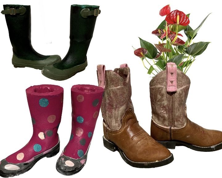 Concrete Boot Planters sold single or in pair. Can custom make your favorite boots. These can be used a decoration or planter, all boots have a water drain hole drilled thru them. All boots have part of the original boot as a “shoe” around the base of the boot that comes on and off. Rain boots: Single- $30 Pair- $50 Cowboy Boots: Single- $60 Pair- $100