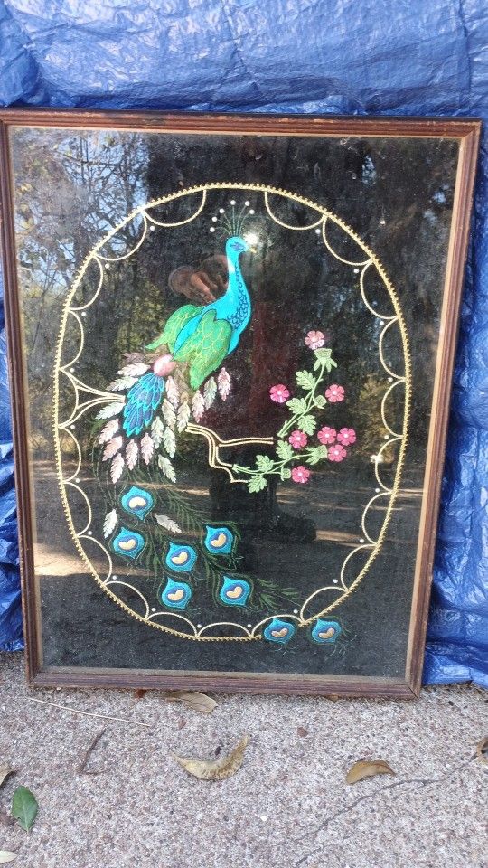 Vintage Velvet Peacock wall art on black velvet.