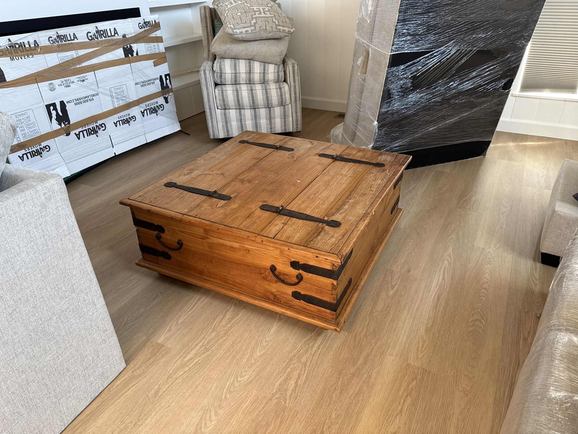 36” x 36” coffee table. Table top is hinged to easily open storage.