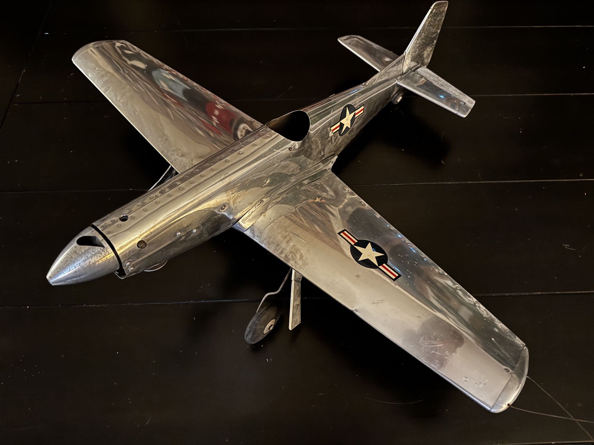 This is a all aluminum and magnesium control line, flyable airplane The wing tips the Elon‘s and other parts are actually magnesium and can be used to identify what company sold the kit back in the 50s. They were expensive then and they’re very expensive now especially in great condition .P51D Mustang is a flyable unit from the early 1950s. I know it’s worth a lot more than I’m asking but I’m just going to get my money back on this one and let it go to someone that loves it instead of just hanging in my garage forever. If you’re looking for a last-minute gift for grandpa, this is sure to impress or a father-in-law that thinks you’re a little soft just kidding. As you can see, the engine is still intact, but the propeller will need to be replaced as it does not have one, but they are very easy to come up with.