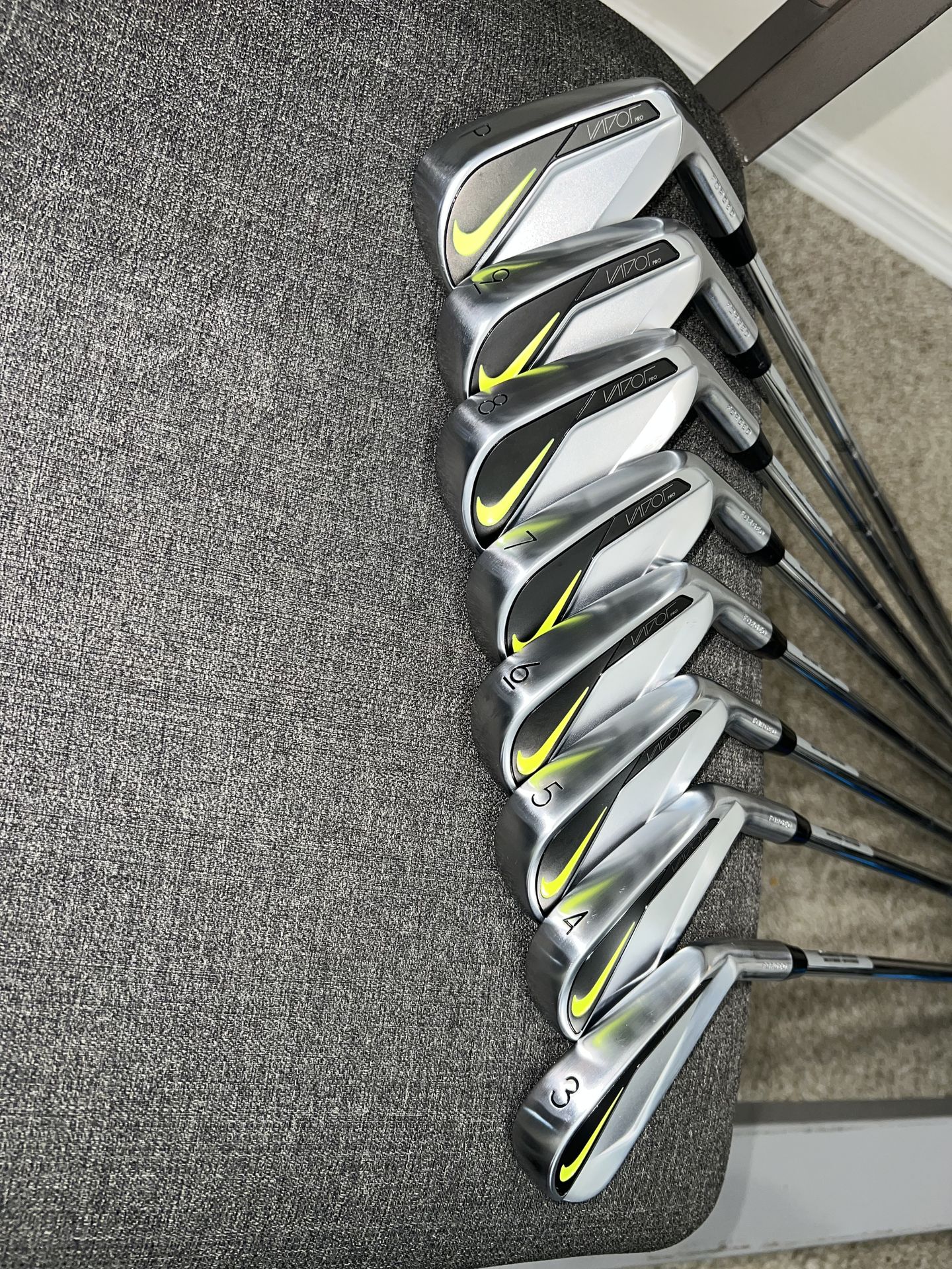 Mint condition 3-pw Nike vapor pro iron set Only hit the 7 iron maybe a dozen times off a mat. See pics for condition Specs: Nike vapor pro iron set Right hand standard length STIFF FLEX true temper dynamic gold s300 shafts Golf pride mcc+4 logo down grips OBO Please don’t message asking if this is still available. If the add is up and or not pending then yes it’s till available. Thank you