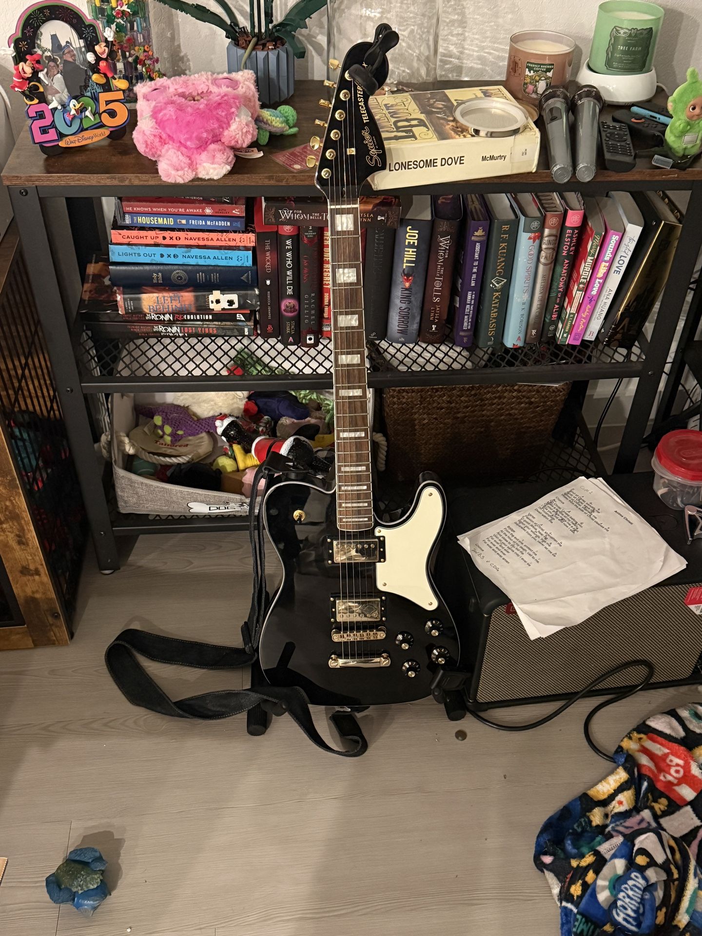 Squier telecaster with Les Paul set up and Strat neck. The hum bucker pick ups are able to be split by lifting the tone knob. comes with hardshell case.
