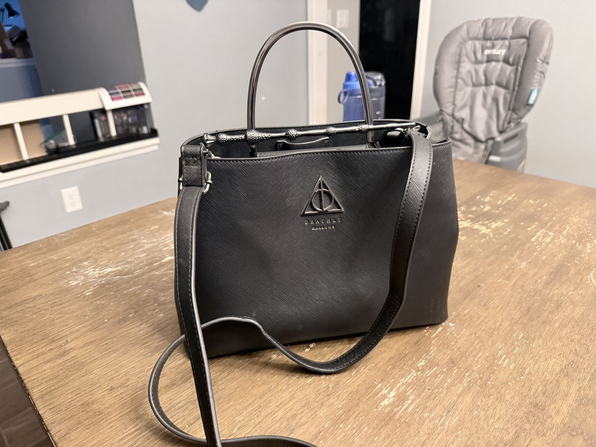Black deathly hallows purse. Minor wear on the metal feet. Manufacturer defect loose string. Used for 1 week.