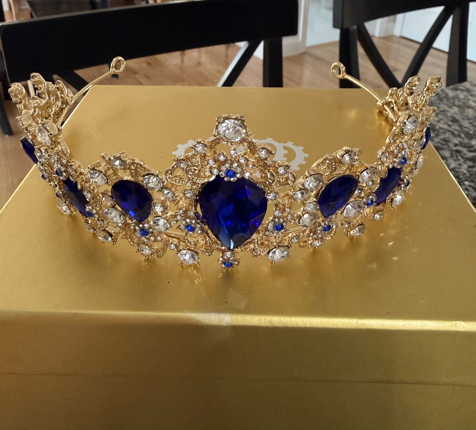 This item is a Baroque-style gold and royal blue crystal tiara. These accessories are typically made with durable alloy metal and adorned with rhinestones.