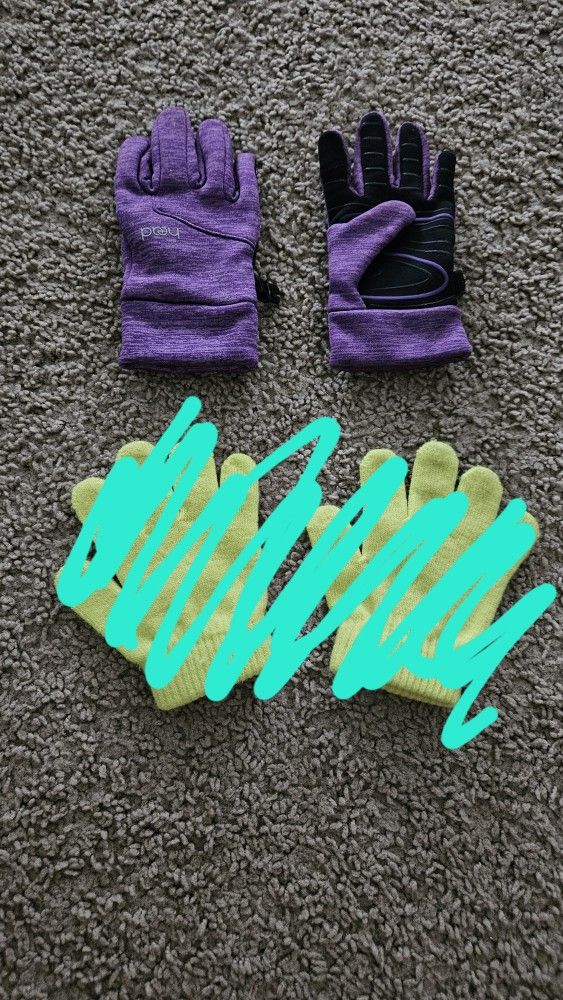 2 pairs of girls gloves.. Purple ones $4 nice gripped ones and warm Yellow ones $1 Will sell seperate