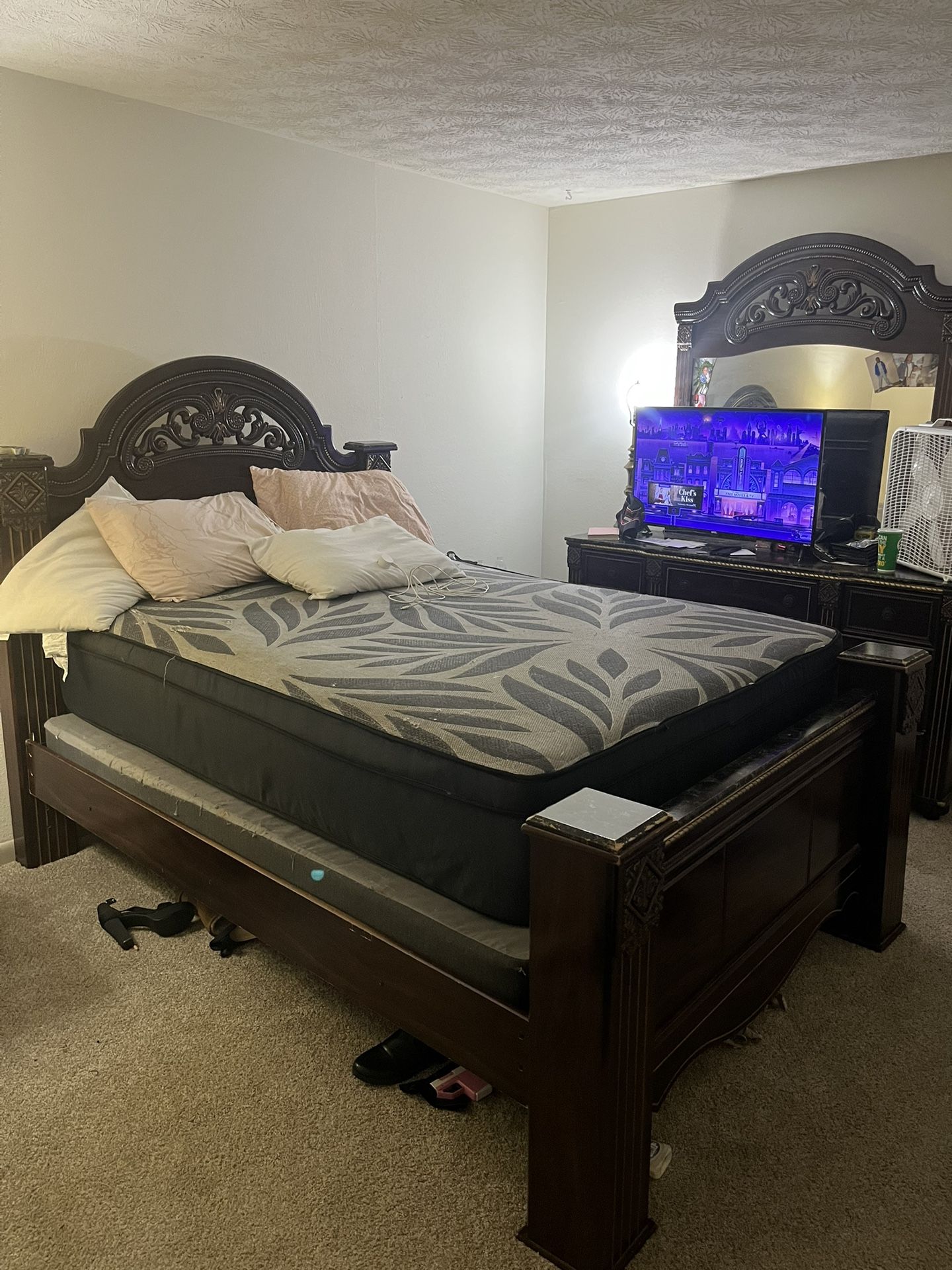 Heavy wood!!! Queen bed (not mattress) 2 night stands 1 long dresser 1 Tall dresser Minor chips and scratches What’s your best offer pick up sandy-springs Will deliver for a extra fee NEED IT GONE BY THE 14th or it will be trashed