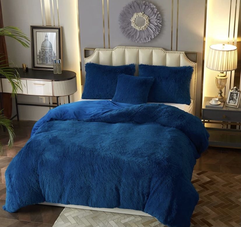 HYBD Plush Shaggy Duvet Cover Queen Size, Fluffy Comforter Cover Set ,Luxury Ultra Soft Velvet Bedding Sets 3 Pieces (90 x 90 inchs Duvet Cover,2 Pillowcases) Zipper Closur Navy Blue