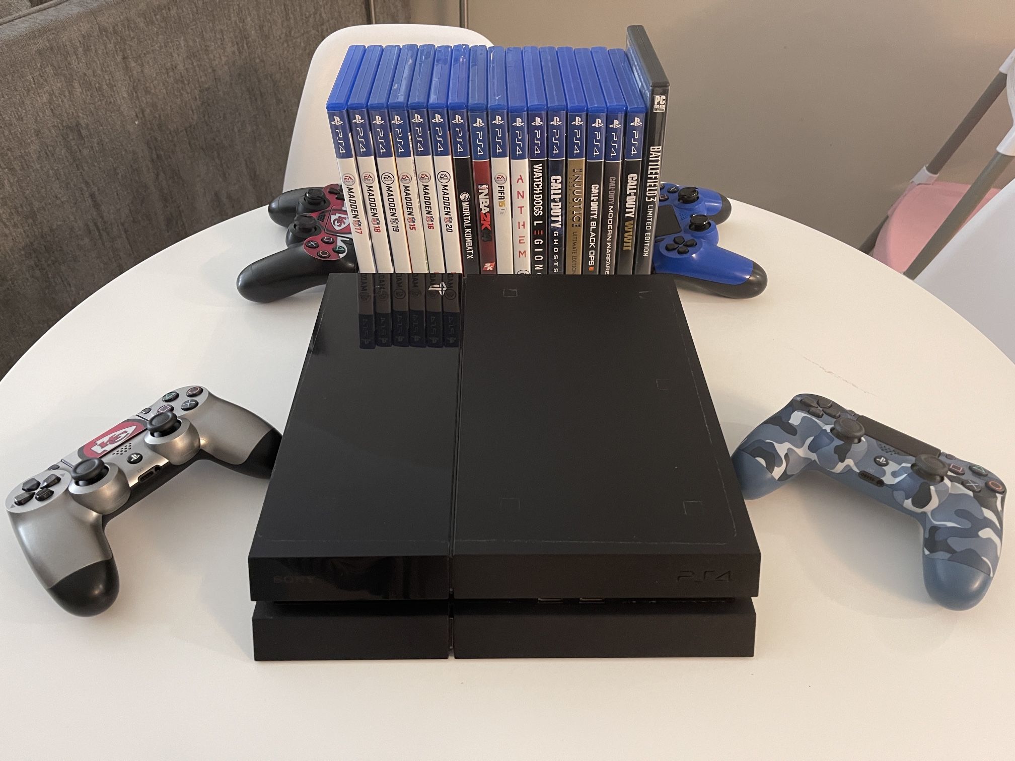 PS4 works as brand new. I just bought PS5 and do not use this one anymore. Comes with 4 controllers and 16 games