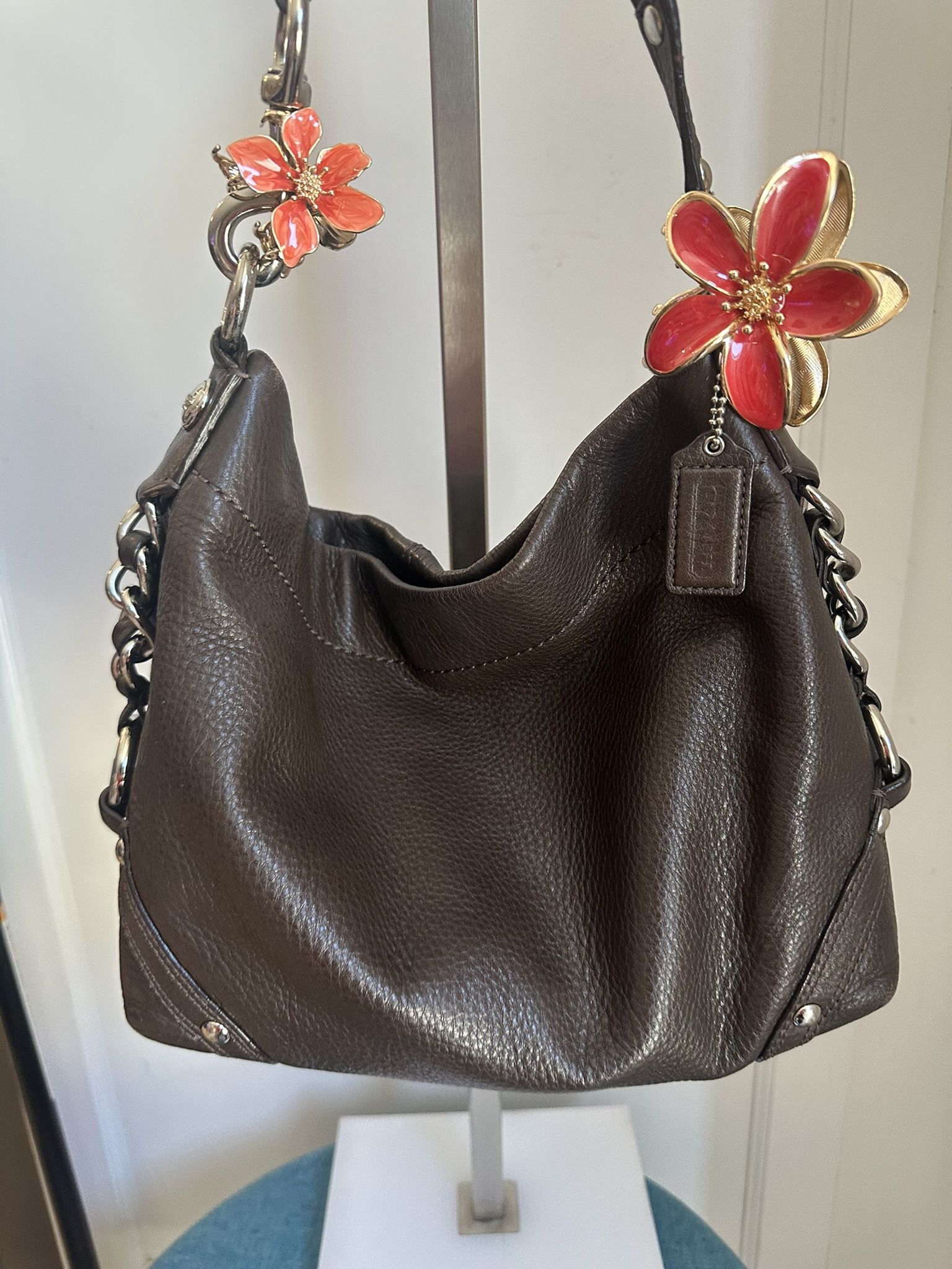 Beautiful Coach leather hobo bag in a rich brown pebbled leather with silver-tone hardware. Features a soft, slouchy silhouette with chain-accented straps and a spacious interior. Interior is lined in a soft lavender fabric with zip and slip pockets—adds a unique pop of color. Great everyday bag with that effortless, relaxed look. Condition: Gently pre-owned. Leather has natural creasing and soft wear that adds to its slouchy character. Minor wear at corners and light edge wear on the strap. There are a couple of light surface scratches consistent with normal use. Interior has been cleaned and shows light signs of use with minor discoloration. Overall presents well and remains fully functional. Approx. measurements: Width: ~12–13 in Height: ~9–10 in Strap drop: ~7–8 in Please review all photos carefully for condition details. Accessories not included.