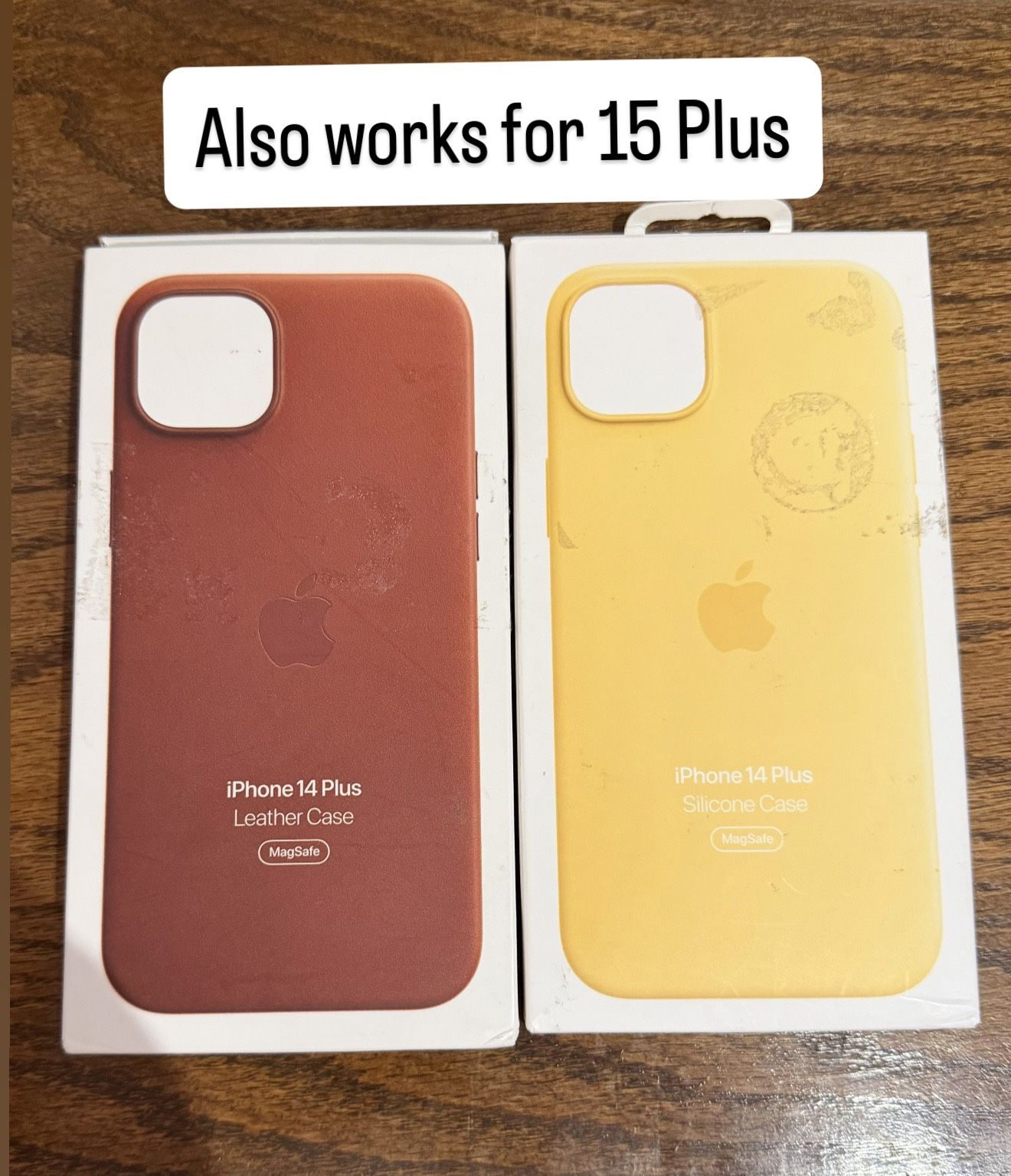 Apple iPhone 15 Plus 14 Plus Leather Silicone MagSafe Protective Case Cover Protector. Works for both iPhone 15 Plus and iPhone 14 Plus. $20 for silicone in yellow sunglow $25 for leather in brown umber - 2 AVAILABLE I traded in my 15 Plus for a new phone and am selling my new in box never used Apple cases.