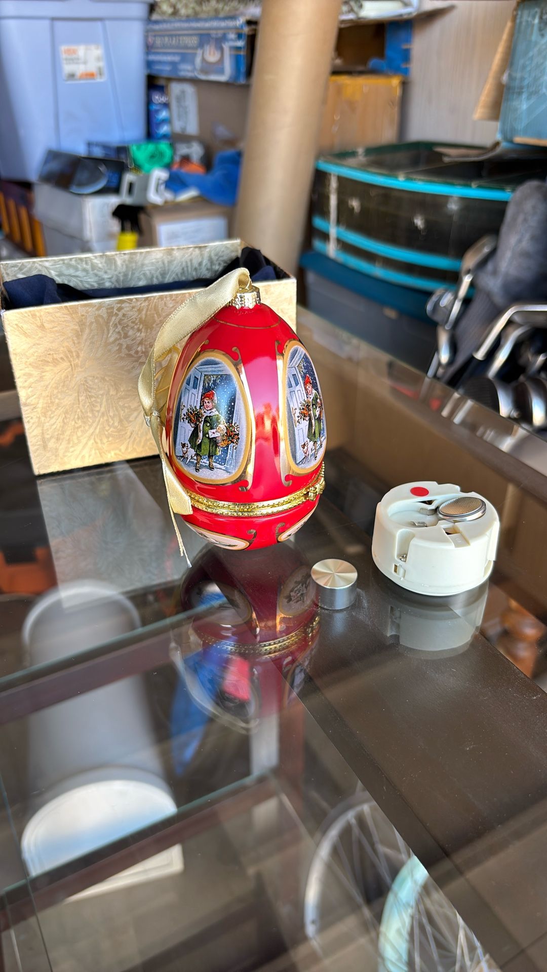 I believe it’s a trinket box. Don’t know if it works. I will have to get some batteries to see if it works, but this will be a cool gift for someone that’s giving somebody a necklace for Christmas or ring and put it in there for Christmas instead of a box, you hang it on the tree or lots a little heavy to put on the tree Around the Christmas sock. It’ll be nice. Do not have the lid for the box. But a nice looking item.