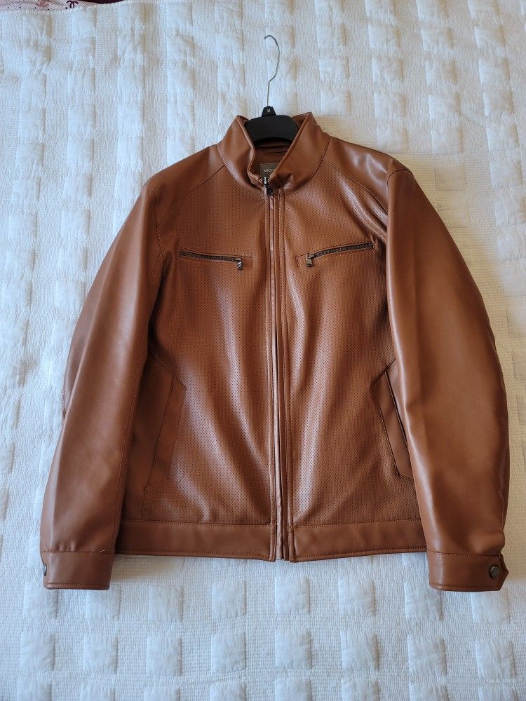 Stylish Michael Kors jacket. Brown leather-look material with cool perforated design. Size L. Has full zip closure and zipper pockets on the chest and sides. Inside lining has Michael Kors logo pattern. Super clean, great condition.