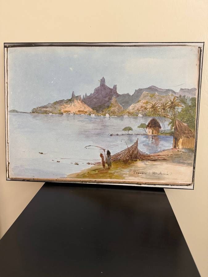 Giclée print of a landscape painting of Teavaro/French Polynesia This is a "Giclée" (I have been told this is a Giclée print - I am not an expert so I am just passing this information along) print. "The painting depicts Teavaro, a village on the island of Mo'orea, which is part of the Society Islands in French Polynesia. The painting showcases the beautiful landscape of Mo'orea, featuring its lush mountains, calm waters, and traditional Polynesian huts." The term "Giclée" refers to a high-quality digital printing process that produces fine art prints with exceptional detail and color accuracy.
