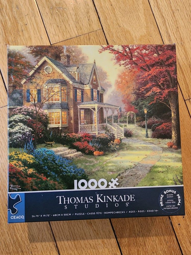 Thomas Kinkade Studios 1000-piece puzzle featuring a beautiful cottage scene. The box was opened and we tried it briefly, but it turned out to be more challenging than expected, so the pieces were put back in the box. Puzzle is complete and in excellent condition. Includes the original box and poster guide. Great for puzzle lovers who enjoy a detailed challenge.