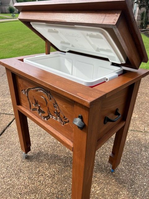 I make custom cooler stands out of beautiful cypress wood. I have several to choose from or send me a picture of what engraving you want. This is a creative way to show team spirit, advertise your company or celebrate a special occasion.