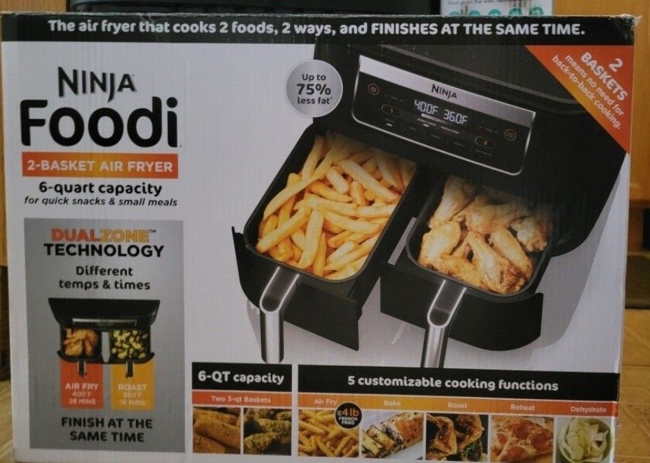 New Ninja 2 basket air fryer that let's you cook 2 seperate things in 2 different baskets. Opened box to make sure all the parts and manuals are there, they are. 6qt capacity .