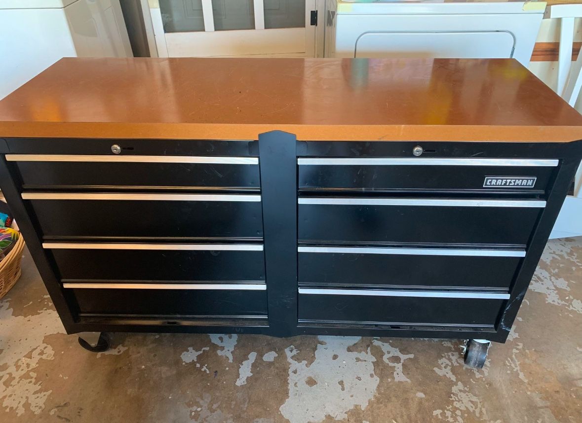 Craftsman steel cart features a hardwood workspace top, eight ball-bearing drawers in various heights, silver-tone drawer trim, and four lockable casters. Drawers are capable of being locked - keys are included. Must pick up/haul away. Dimensions 53.0" W x 33.0" H x 18.0" D