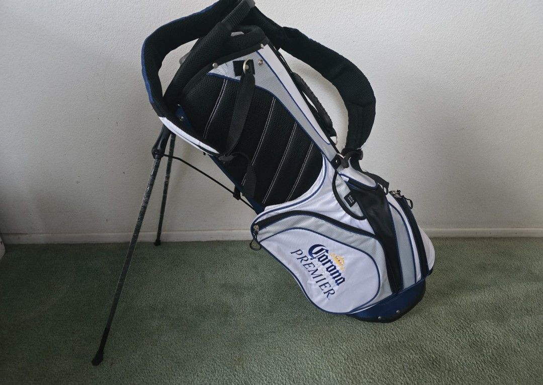 The Corona Premier Beer Golf Stand Bag in white is a stylish and functional accessory for any golf enthusiast. Made of durable nylon with a plastic frame, this stand bag features a zip closure for easy access to your golf essentials. The addition of a shoulder strap makes it convenient to carry your bag around the course, while the Corona branding adds a touch of style. Perfect for men or women who enjoy both golf and beer, this stand bag is a must-have for any golfer looking for a sturdy and fashionable bag to carry their gear.
