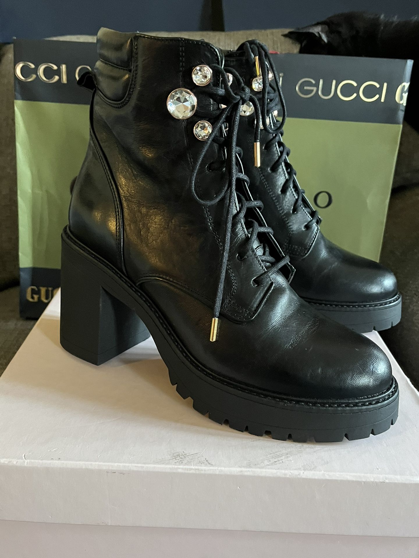 , SOPHIA WEBSTER Zadie Leather Napa Boots Round toe Lace-up vamp Leather lining Trim: Crystal embellishment Synthetic sole Made in Portugal ๐ต๐น Retail Price $750 plus Taxes Size 40 Heel, 3.5" (89mm) Platform height, 1" (25mm) Shaft height, 5.5" Leg opening, about 3" , Come With Box and Dust Bag