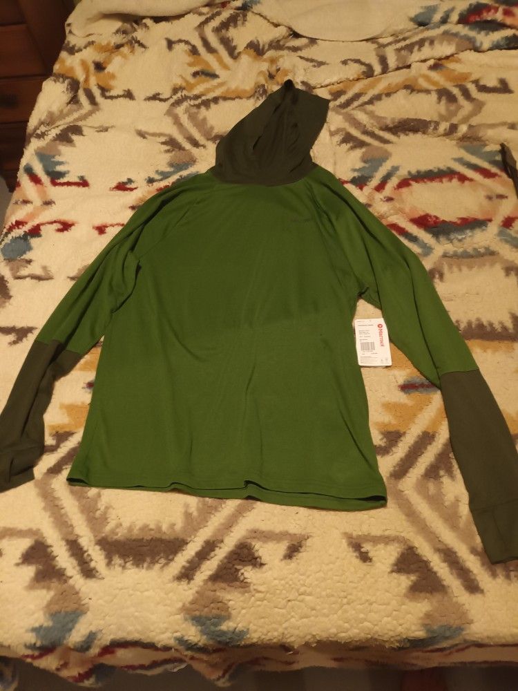 Marmot hoodie, thin but warm, very packable. Sleeves have thumb holes. Size large, unused, brand new