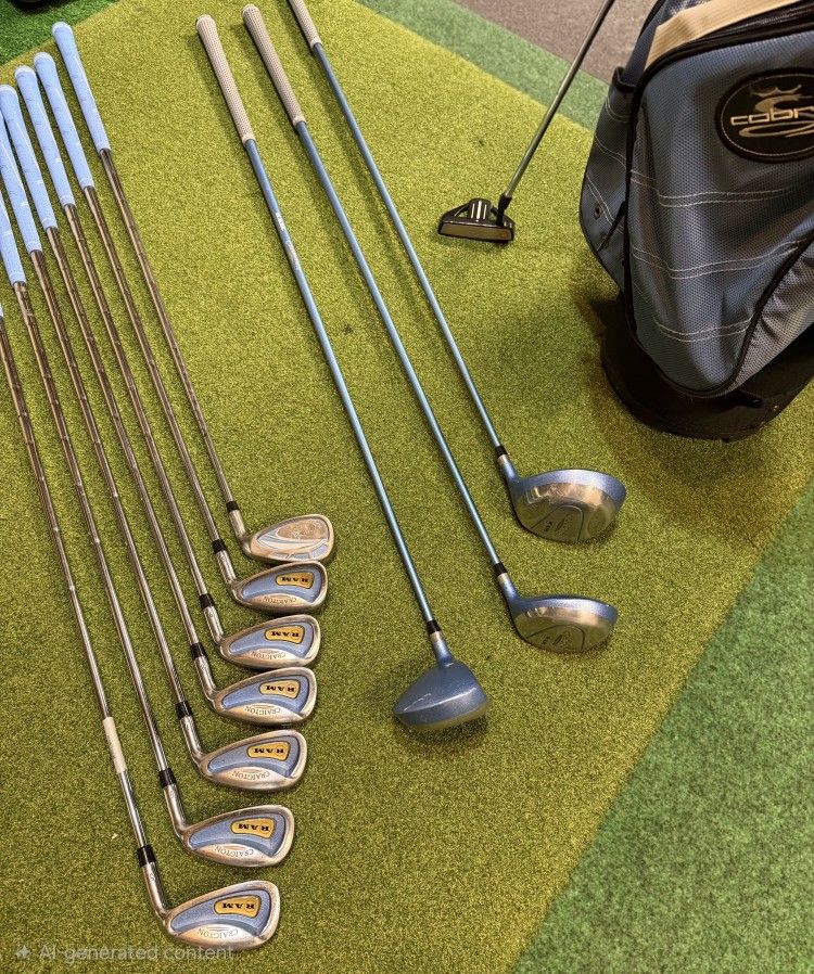 Ladies beginners complete golf set. Includes 5i-PW+SW, Driver, 3+5 wood+putter and Cobra 5 way divider cart bag. All have new grips. Set is ready to play and look good playing. Cash preferred.